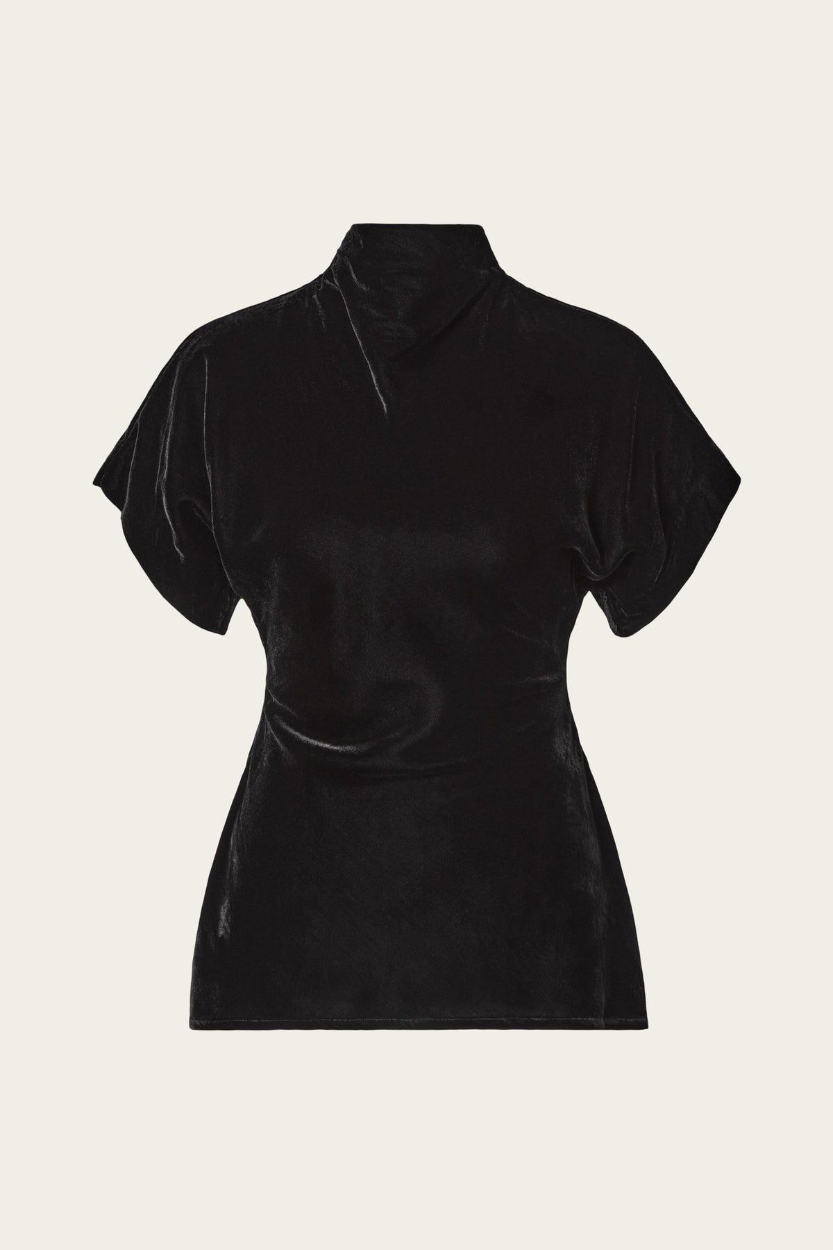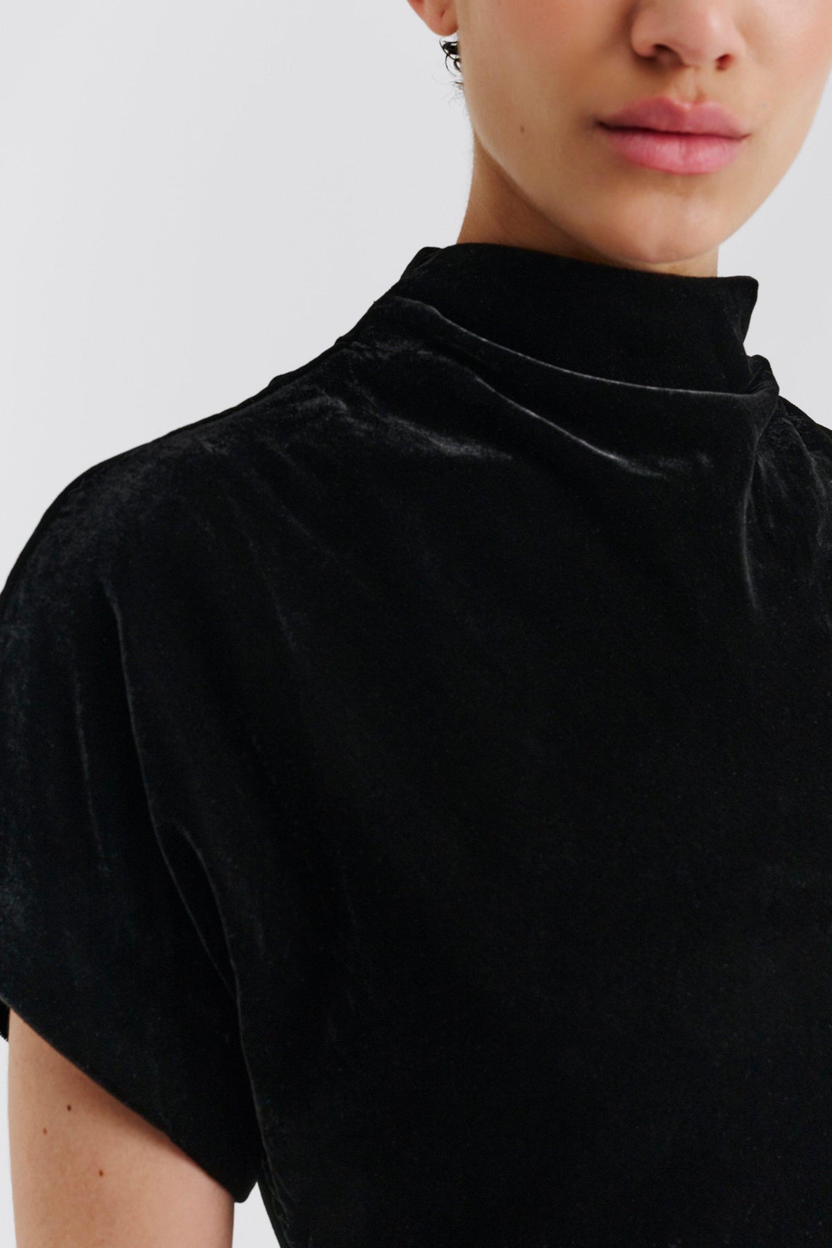 Malinan upea samettipusero pusero, jossa on pieni poolomainen vesiputouspääntie. Pitkä vetoketju takana, helppo pukea sotkematta meikkiä.