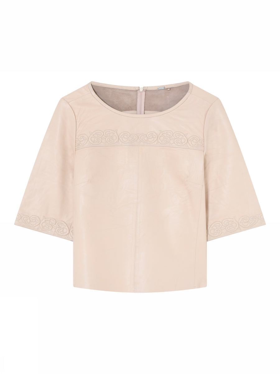 Kauniisti leikattu, pehmeä nahkainen pusero, jossa runsaasti erityisen kauniita koriste tikkauksia.