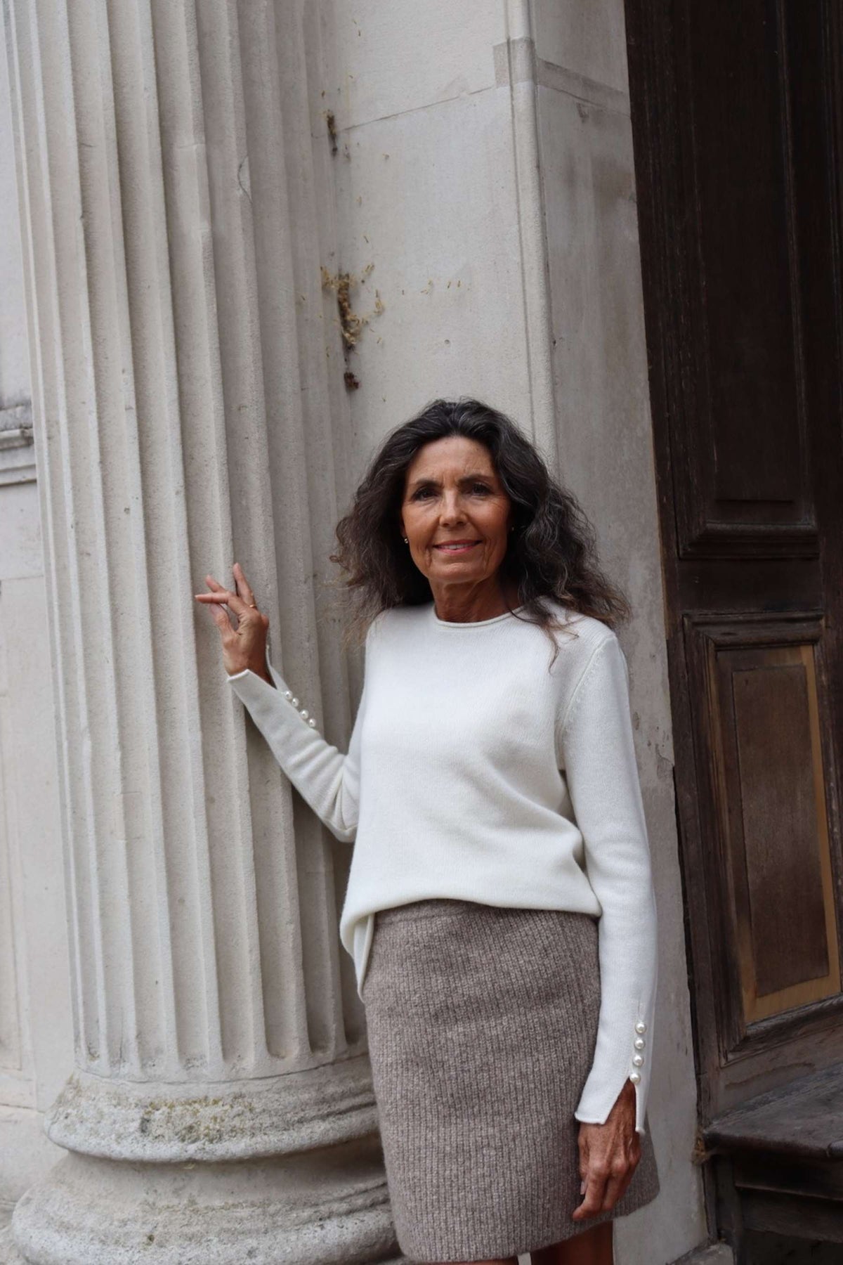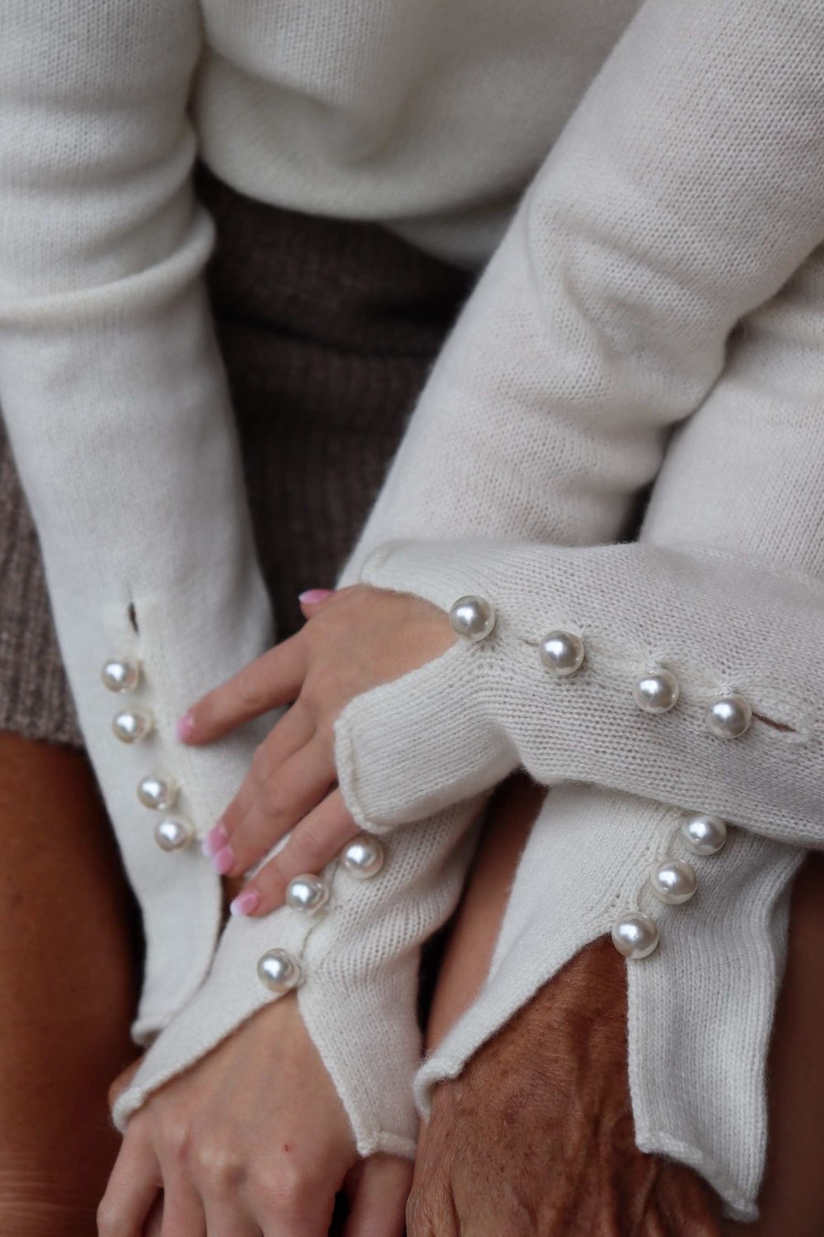 Ylellisessä 100% kashmirneuleessa on neljä kiinni ommeltua helmiäisnappia molemmissa hihaansuissa.
