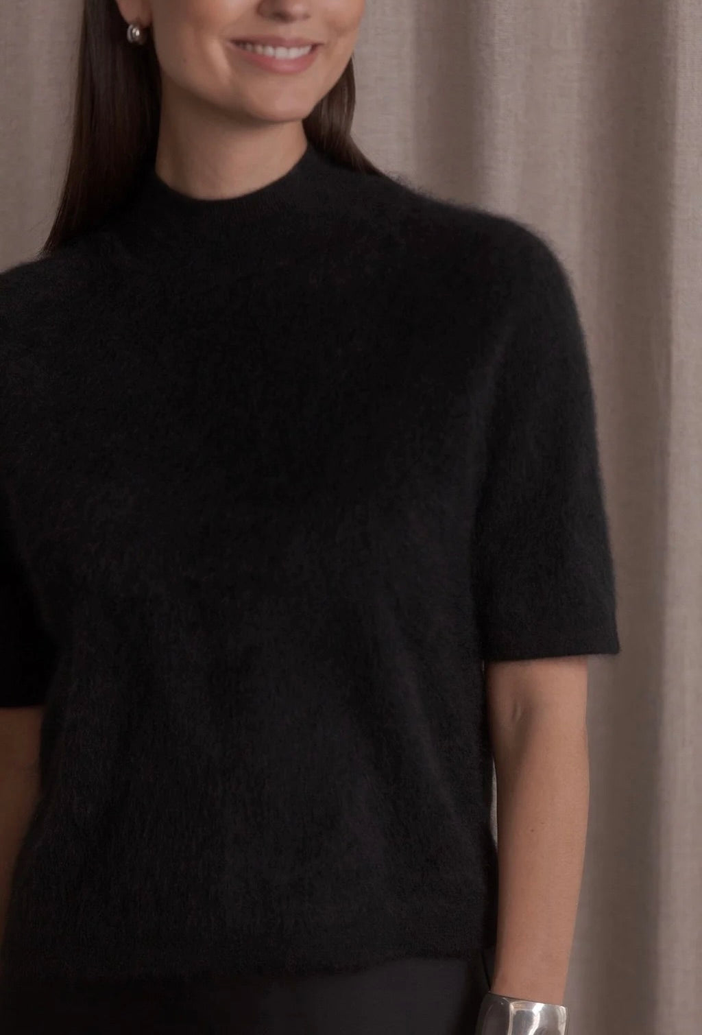 Lyhythihainen kashmirneule puolipoolokauluksella. Istutettu hihalinja antaa ryhdikkään ilmeen ja istuvuuden. Kapeat neuloskäännökset hihansuissa ja neuleen alareunassa.