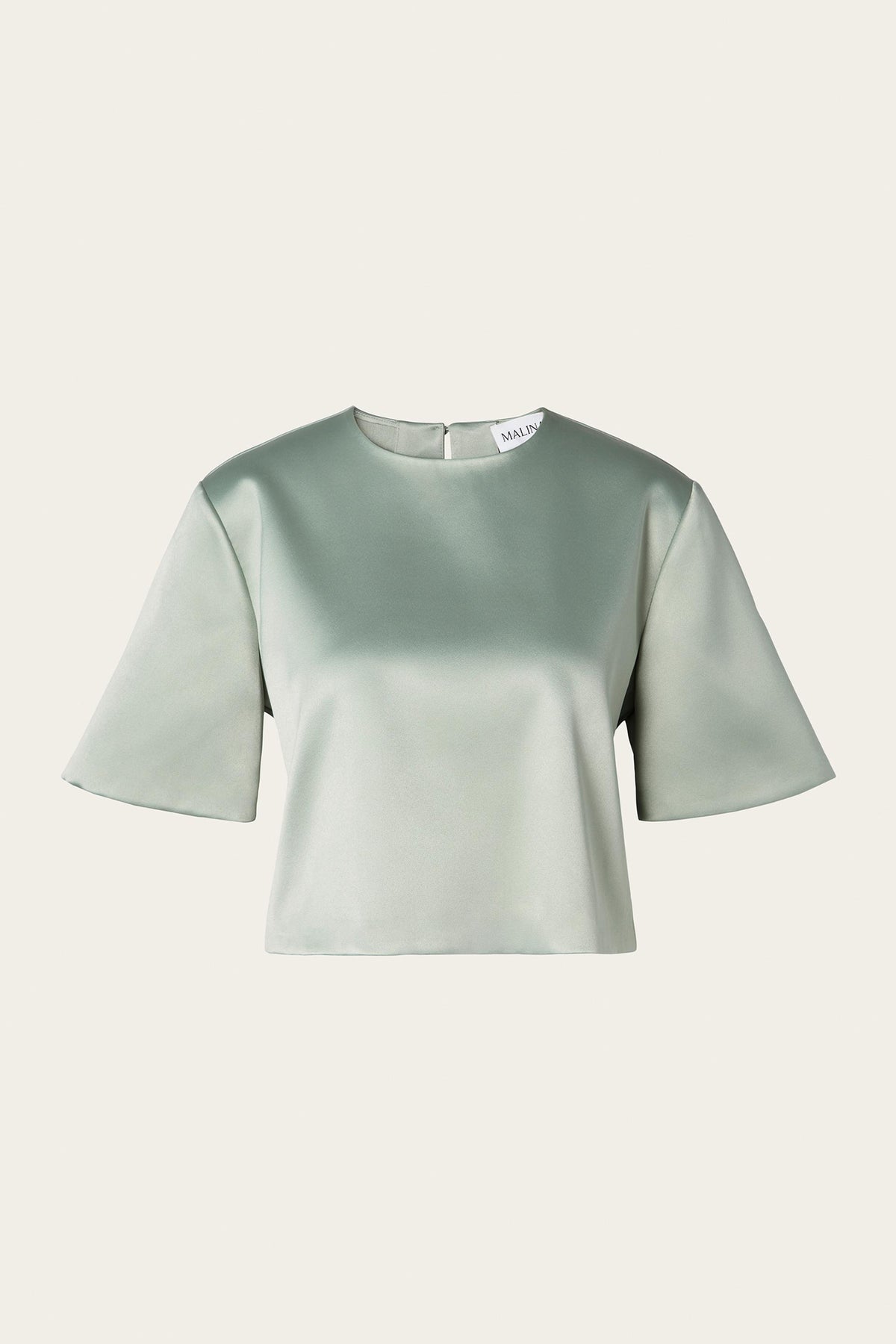 Laatikonmallinen kauniisto laskeutuva jämäkästä satiinista valmistettu pusero, jossa kaksi nappia takana.