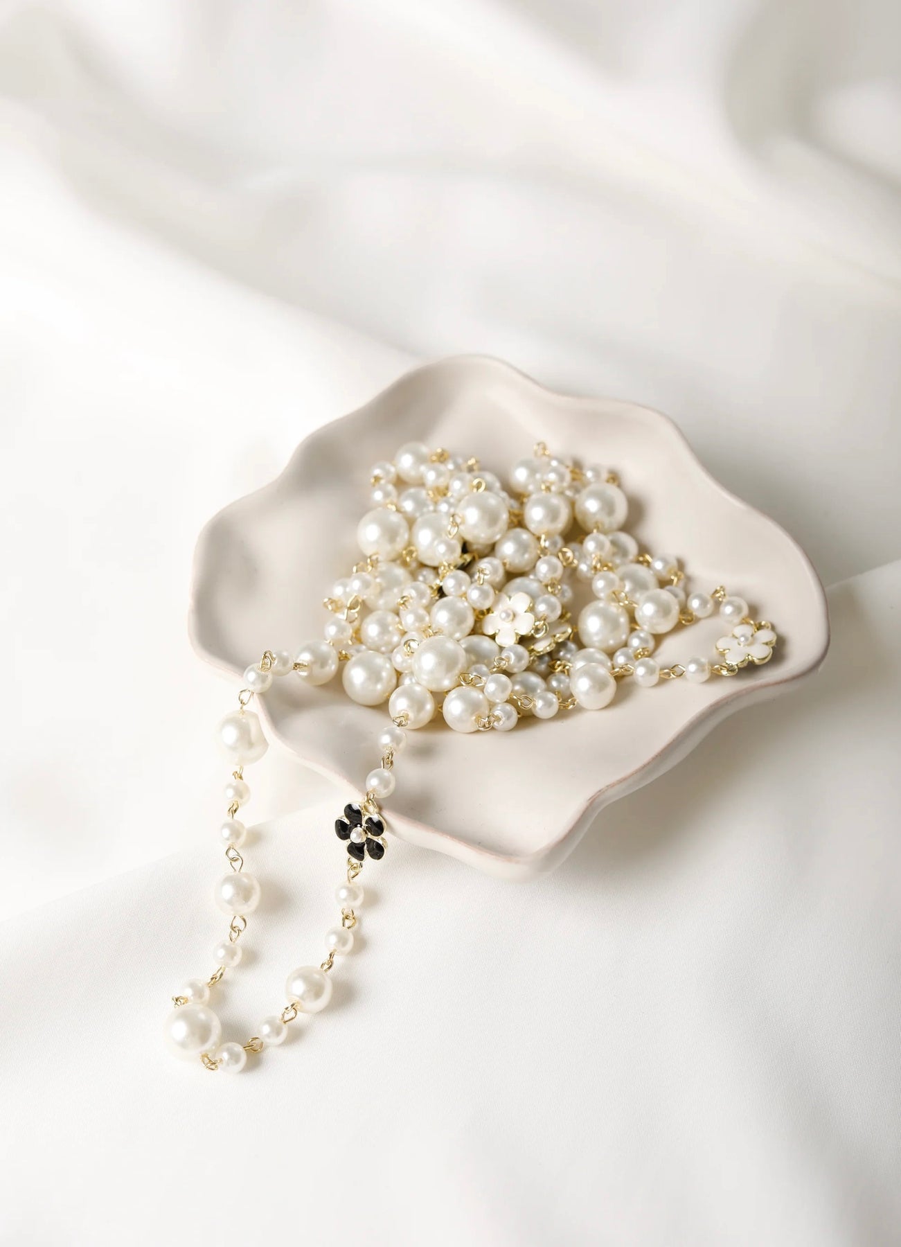 Pitkä liidunvalkoinen helmikaulakoru kultaisella ketjulla sekä mustilla ja valkoisilla kukkakoristeilla. Kukkakoristeissa on kultainen reunus ja keskellä pieni helmi.