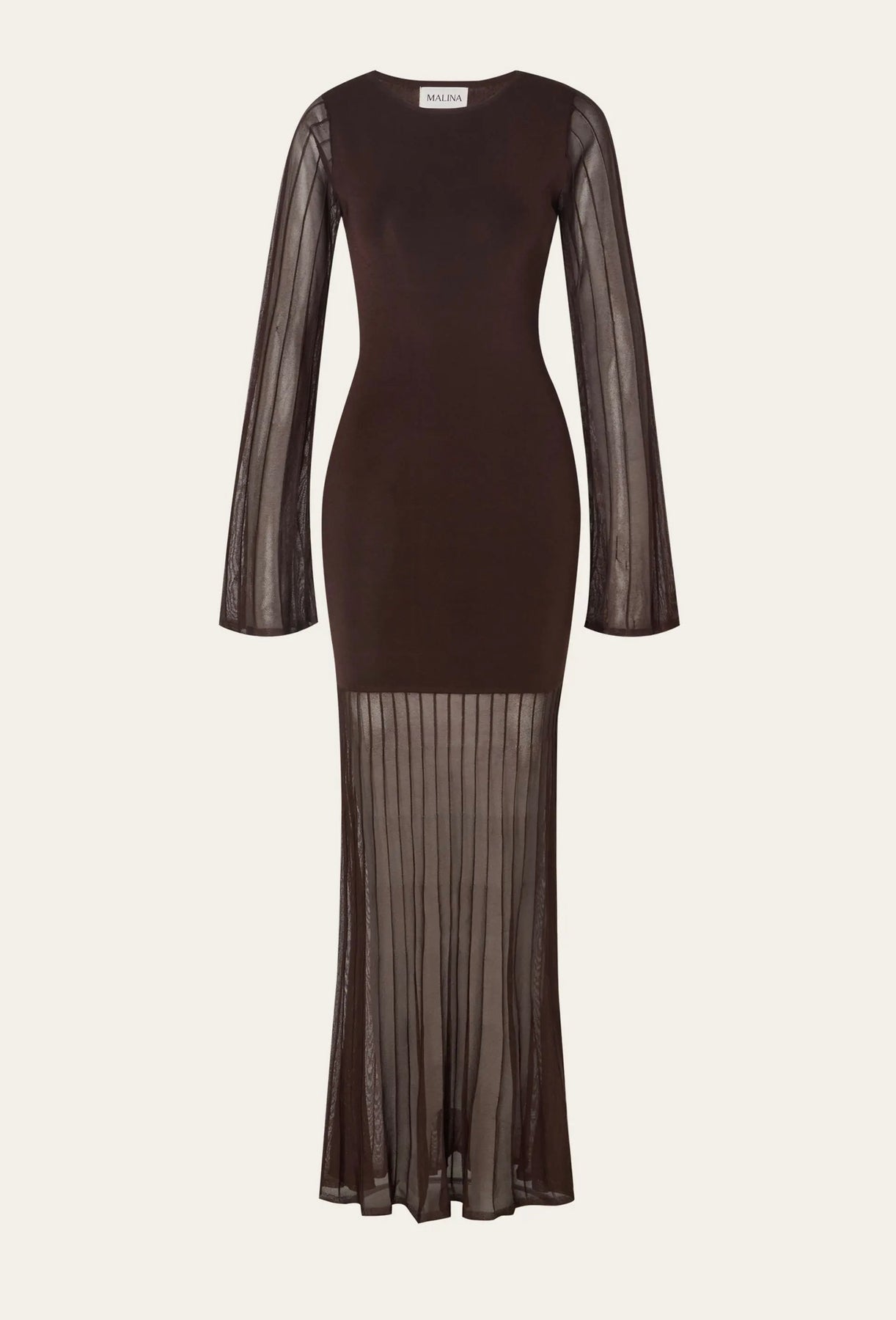 Malina vartalonmyötäinen läpikuultava neulottu maximekko, jossa on strukturoitua kangasta. Vartalonmyötäinen yläosa, leveät läpikuultavat hihat ja helma.