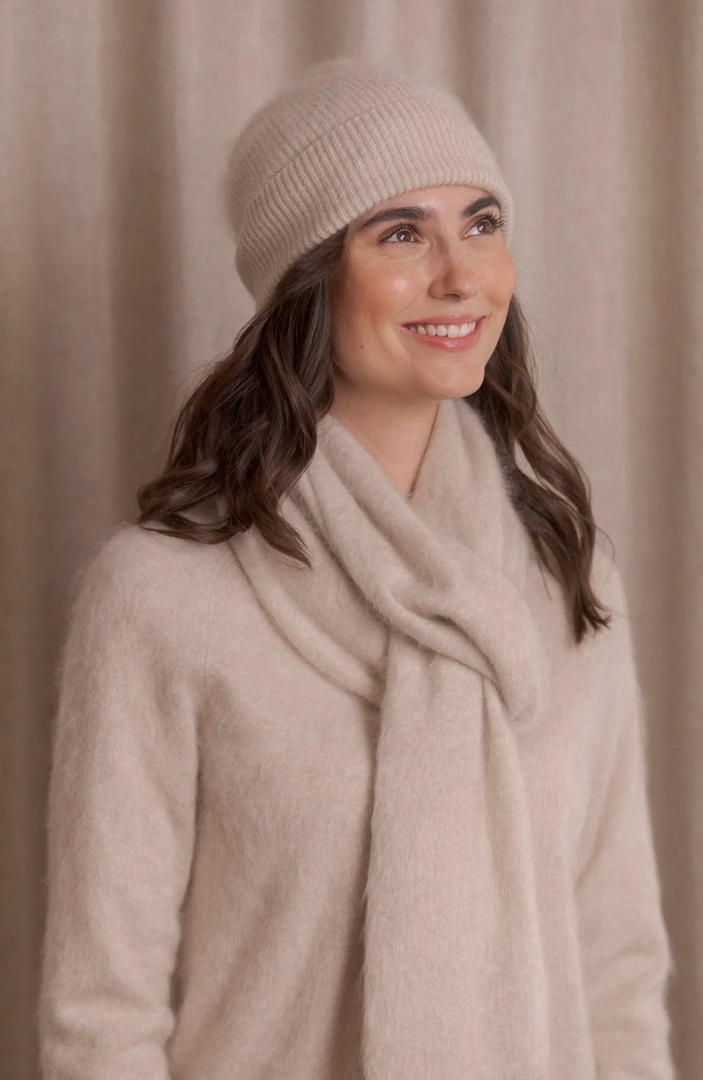 Tämä joustinneulospintainen pipo on valmistettu erityisen pehmeästä harjatusta kashmirista ja siinä on leveä käänne. pipon korkeutta voi säätää helposti käänteen leveyttä muuttamalla.